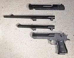 Switching a Desert Eagle to another chambering requires only that the correct barrel, bolt assembly, and magazine be installed. Thus, a conversion to fire other cartridges can be quickly accomplished. The rim diameter of the .50 AE (Action Express) is the same as the .44 Remington Magnum cartridge, consequently, only a barrel and magazine change is required to convert a .44 Desert Eagle to the larger, more powerful, .50 AE round.[5][6] The most popular barrel length is 6 in (152 mm), although a 10 in (254 mm) barrel is available. The Mark XIX barrels are machined with integral scope mounting bases, simplifying the process of adding a pistol scope.