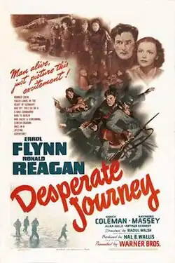Desperate Journey is a 1942 American World War II action and aviation film directed by Raoul Walsh and starring Errol Flynn and Ronald Reagan. The supporting cast includes Raymond Massey, Alan Hale Sr., and Arthur Kennedy. The melodramatic film featured a group of downed Allied airmen making their way out of the Third Reich, often with their fists.[Note 1]
