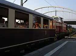 Dessau Hauptbahnhof (main station) has connections to Magdeburg, Berlin, Leipzig, Halle, Bitterfeld and Lutherstadt Wittenberg. The line from Berlin was opened on 1 September 1840. The Dessau-Bitterfeld line (opened on 17 August 1857) was electrified in 1911, the first fully electrified long-distance railway in Germany. Dessau was part of the InterCity long-distance network until the year 2002. Regional trains also stop at the stations Dessau-Süd, Dessau-Alten, Dessau-Mosigkau and Rodleben. The Dessau-Wörlitzer-Eisenbahn (railway) connects Dessau to Wörlitz, a town situated 15 km to the east, and the Wörlitzer Park. The starting point of this railway is the main station. This train also stops at the stations Dessau-Waldersee and Dessau-Adria.