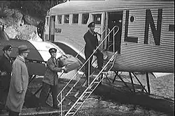 In 1933, Thomas S. Falck was appointed director of Bergenske Dampskibsselskab (BDS).[7] Fred. Olsen wanted a partner for DNL, in part to strengthen its geographic spread, and meetings were held between Olsen family and Falck to introduce the Bergen-based company as a partner in DNL. On 7 November 1934, Bergenske became a partner in DNL, and the company renamed Det Norske Luftfartselskap Fred. Olsen og Bergenske A/S. Johan Wulfsberg from BDS became a board member of DNL. As a reply to DNL's new concession application to make short-term sea plane routes using a Junkers Ju 52, the government urged DNL to make an alliance or merger with Widerøe. By then, four regional shipping companies—Vesterålske, Nordenfjeldske, Stavangerske and Arendalske—had bought the majority of Widerøe.[8]