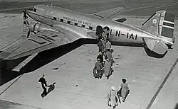 To start the route from Oslo to Bergen immediately, a Ju 52 was wet leased from Lufthansa. It was delivered on 7 June and initially kept the blue Lufthansa livery, including a swastika. The aircraft was registered as LN-DAE, christened Havørn and later received DNL's livery. Operations were scheduled to commence on 7 June, but fog forced a delay until 11 June. After that there were flown 180 trips with a 100% regularity. Training was done by German crew on board Havørn. Travel time from Oslo to Bergen was four and a half hours, with intermediate stops in Moss, Arendal, Kristiansand, Stavanger and Haugesund. It cost NOK 95 to fly the full journey. During the first season, DNL transported 3,214 passengers and 31.6 tonnes (31.1 long tons; 34.8 short tons) of mail. It also took over Norwegian representation for Aerotransport, DDL, KLM, Sabena, Air France and Aero, and joined the International Air Traffic Association. At the end of the year, Havørn was purchased. On 6 June 1936, DNL registered its second Ju 52, LN-DAF Najaden. After the Havørn Accident eleven days later, the airline purchased another Ju 52, LN-DAH Falken, used from Lufthansa.[12]