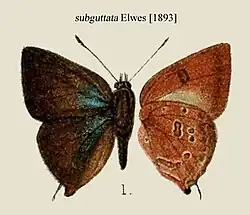 - ^ Elwes, H.J., [1893]. On butterflies collected by Mr. W. Doherty in the Naga and Karen Hills and in Perak (part ii). Proceedings of the Zoological Society of London. 1892: 617–664, pls 43,44.