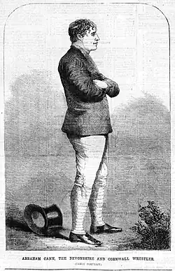 - Abraham Cann (1794[23]-1864) was born in Crediton[36] and was a famous wrestler who had an infamous wrestling match with James Polkinghorne[37] in Devonport in 1826, watched by a crowd of over 10,000. After discussions between the triers, the match was declared a draw.[38][39][40] A song was written about the match.[41][42] He was the champion wrestler of England.[43] It was claimed that he became champion of the world.[44][45] His father, Robert, and brothers: James (?-1849[46]), Robert, George and William (1793-1872[47]) were also successful wrestlers.[48][49][44] Cann had defeated John Jordan, Flower, Wreyford, Simon Webber, and the other good wrestlers in Devon, and carried off the prizes at many of the places where he became a competitor.