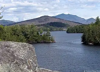 ![]() Dewey Mountain (center), Saranac Lake, New York, from Bluff Island, Lower Saranac Lake. McKenzie Mountain at right | |