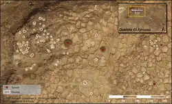 Dhar Tichitt is a line of sandstone cliffs located in the southwestern region of the Sahara Desert in Mauritania that boasts a series of eponymous Neolithic archaeological sites. It is one of several in the area belonging to the Tichitt culture, including Dhar Tichitt, Dhar Walata, Dhar Néma, and Dhar Tagant.[1] Dhar Tichitt, which includes Dakhlet el Atrouss, may have served as the primary regional center for a hierarchical social structure within the Tichitt Tradition.[2] The cliffs of Dhar Tichitt were inhabited by pastoralists and farmers between 4000 BP and 2300 BP,[3] or between 2000 BCE and 300 BCE.[4][5]