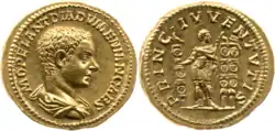 Aureus of Diadumenian. The reverse depicts him as princeps iuventutis (official heir) between military standards.[15]