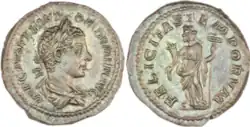Having served as praetorian prefect under Caracalla, Macrinus participated in a plot to have the Emperor assassinated and exploited the resulting power vacuum to seize the throne for himself on 11 April 217, three days after Caracalla's death.[7] Shortly after, the eight-year-old Diadumenian was elevated to caesar – formalising his position as heir to the throne – at Zeugma, while his guard was escorting him from Antioch to Mesopotamia to join his father. He was also given the name Antoninus, in honour of the Antonine dynasty, at this time.[6][8] On 16 May 218 a revolt against him and his father was launched in Emesa by Elagabalus, whose mother, Julia Soaemias, was Caracalla's cousin. In order to put down the revolt, Macrinus led his legions to a fort at Apamea. There Macrinus elevated Diadumenian to augustus, making him co-emperor. After Macrinus was defeated by Elagabalus on 8 June 218, at the Battle of Antioch, Macrinus fled north and then to the Bosporus. Before fleeing, he entrusted Diadumenian to loyal servants, instructing them to take him into the Parthian Empire, to the court of Artabanus IV, to ensure his safety. Diadumenian was captured en route in Zeugma and executed in late June.[9][10] His head was brought to Elagabalus and reportedly kept as a trophy.[11]