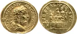 Aureus of Macrinus, which features Diadumenian on the reverse, seated on a platform alongside his father, with the allegory of Liberalitas before them.[14]