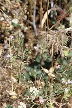 Dianthus nudiflorus, synonym Velezia rigida, is a species of flowering plant in the family Caryophyllaceae. It is native to the Mediterranean Basin countries of Europe and North Africa, and to western and central Asia and Pakistan.[1] It is also present in northern California where it is an introduced species. It is an annual herb growing from a taproot and producing a hairy, glandular, branching green or purplish stem up to 40 centimeters tall. The linear leaves are up to 2 centimeters long. Solitary flowers occur in the leaf axils. Each flower has a very long, cylindrical, ribbed calyx of fused sepals forming the tubular throat of the flower, measuring at least a centimeter in length. At the top of the tube is the flower corolla which has five pink or purplish petals.