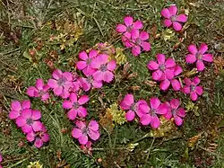 Dianthus pavonius is a hemicryptophyte scapose plant[2][3] reaching 2–25 centimetres (0.79–9.84 in) in height.[4][3] This short-stemmed carnation occurs in dense clumps. It has bluish-greenish pointed leaves and purple-pink coloured flowers, with a blue or brown heart. The flowering period extends from April through May.[5] The fruits are cylindrical capsules with several flat brown seeds.[3]