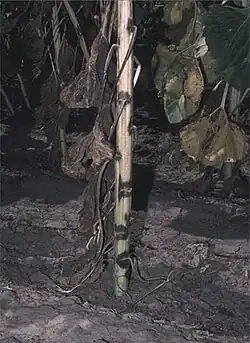 Stem canker on sunflower is caused by the fungal pathogen Phomopsis helianthi (teleomorph = Diaporthe helianthi).[1] There are many "Phomopsis" species that have a broad host range, but "Phomopsis helianthi" is the primary pathogen that infects sunflower, although it has also been seen to infect other, secondary hosts. Some "Phomopsis" species have been found to be able to cause disease on several host genera.[2] Sunflower hosts that found in high densities are particularly susceptible to attack by the pathogen due to the microclimate formed in crowded areas. This microclimate has a high humidity and allows for infection to proceed rapidly.[3] There has also been recent molecular evidence to suggest there are several genetically distinct species of Phomopsis that can cause disease on the sunflower hosts.[3]