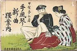 A school boy playing harmonica, and a school girl playing one-row diatonic accordion. A self-study book published in 1899 in Japan.