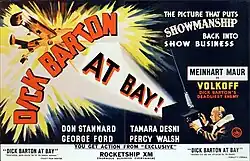 Dick Barton at Bay is a 1950 British second feature ('B')[1] spy film directed by Godfrey Grayson and starring Don Stannard.[2] It was written by Ambrose Grayson and was intended to be the second of three films that Hammer Film Productions made about the British agent Dick Barton, although it was the last one to be released, following Dick Barton: Special Agent (1948) and Dick Barton Strikes Back (1949).[3] The film started production on March 4, 1948 (intended to be the 2nd film in a Dick Barton trilogy), but it was only trade shown on Sept. 2, 1950, and theatrically released on Oct. 2, 1950. The film's original working title was Dick Barton and the Ray of Death.[4]