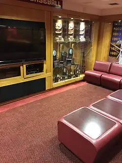 Florida State's baseball program has had many outstanding players and has enjoyed much success throughout the decades. To commemorate their storied baseball program, they have built a large tradition room to honor players, coaches, and the university program as a whole. The Mike Loynd Tradition Room is located next to the Griffin Family Clubhouse under the first base stands. The trophy room as stated above showcases the stories of the great players in Florida State baseball history telling of their stories and successes. The room holds awards, plaques, championships, and more. Inside of the tradition room is a lounge area with multiple televisions that continually broadcast historic moments that have occurred within the baseball program throughout the years. On the walls of the tradition room there are tributes to the Seminole teams that made twenty-one appearances to the College World Series, and appeared in seventeen conference championship games. In addition to team awards certain individuals were signaled out and awarded for their excellence. The individual awards are showcased in glass cases; they include the four Golden Spikes Awards (an award given to the best NCAA division one player in the country) won by, Mike Loynd, Mike Fuentes, J. D. Drew, and Buster Posey. Additionally other individual awards that are on display include the coveted Gold Glove Award, an award that honors the best defensive player in the country at their given position. Buster Posey most notably won both the Golden Spikes Award and the Golden Glove Award. He was the first Seminole baseball player to be presented with the award in only its second year of being given as an award.[5]