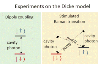 In 2010, the superradiant transition of the open Dicke model was observed experimentally using neutral Rubidium atoms trapped in an optical cavity.[22] In these experiments, the coupling between the atoms and the cavity is not achieved by a direct dipole coupling between the two systems. Instead, the atoms are illuminated by an external pump, which drives a stimulated Raman transition. This two-photon process causes the two-level system to change its state from down to up, or vice versa, and emit or absorb a photon into the cavity. Experiments showed that the number of photons in the cavity shows a steep increase when the pump intensity crosses a critical threshold. This threshold was associated with the critical coupling of the Dicke model.