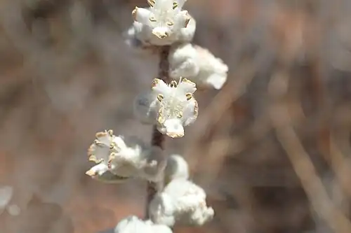Dicrastylis costelloi is a shrub, growing to about 40 cm high on red sands. Its stems are roughly circular in cross section with no peltate scales. The opposite and entire leaves are 8–25 mm long by 3.2–6 mm wide, and have branched (dendritic) hairs. There are bracteoles (1–2 mm long), and bracts (5–9 mm long. The flowers are sessile. The calyx has five lobes (1.5 mm long), covered in dendritic hairs, and the white or cream corolla is 4.5–5 mm long, with no dots or stripes in its throat. There are five stamens. In Western Australia it flowers in October.[5]
