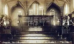 The Old Chapel building, originally the college chapel, is one of the campus's listed buildings, gaining Grade II listed status on 6 June 1994. It is a two-storey building constructed in gothic style, with Flemish bond brickwork, built on a sandstone plinth in 1842.[94] It is also likely to be the work of Richard Lane.[33] The structure consists of three wings, containing a central hall range, with two domestic wings on each side,[94] initially used as tutor accommodation,[33] forming a symmetrical appearance with the gable end of the upper hall.[94] For many years it was used as a library and lecture theatre. The ground floor eventually became the student union, and contained a bar and café.[95][96] The first floor was used as the base of ESRI (Education and Social Research Institute) and lecture space.[97]