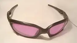 Didymium (Greek: δίδυμο, romanized: dídymo, twin) is a mixture of the elements praseodymium and neodymium. It is used in safety glasses for glassblowing and blacksmithing and filter lenses for flame testing, especially with a gas (propane)-powered forge, where it provides a filter that selectively blocks the yellowish light at 589 nm emitted by the hot sodium in the glass without having a detrimental effect on general vision, unlike dark welder's glasses and cobalt glasses.[1] The usefulness of didymium glass for eye protection of this sort was discovered by Sir William Crookes.