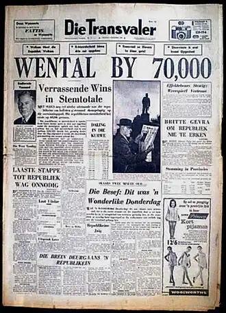 Die Transvaler was a South African newspaper founded in 1937 with the aim of promoting Afrikaner nationalism and supporting the Transvaal branch of the National Party.[1] Hendrik Verwoerd was its first editor.[2]