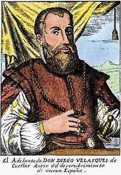 Diego Velázquez de Cuéllar[note 1] (1465 – c. June 12, 1524) was a Spanish conquistador and adelantado who was first governor of Cuba. In 1511 he led the successful conquest and colonization of Cuba. As the first governor of the island, he established several municipalities that remain important to this day and positioned Cuba as a center of trade and a staging point for expeditions of conquest elsewhere. From Cuba, he chartered important expeditions that led to the Spanish discovery and conquest of the Aztec Empire.
