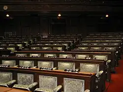 The chairman sits in the center accompanied by the secretary general on his right. The podium stands in front of the chairman's seat, and the stenographer sits beneath the podium. Two rows of seats stretch on both sides of the chair, the front row for cabinet members (the seat closest to the chairman is for the Prime Minister) and the back row for the Diet administrative staffs.