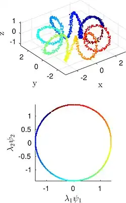 Diffusion maps is a dimensionality reduction or feature extraction algorithm introduced by Coifman and Lafon[1][2][3][4] which computes a family of embeddings of a data set into Euclidean space (often low-dimensional) whose coordinates can be computed from the eigenvectors and eigenvalues of a diffusion operator on the data. The Euclidean distance between points in the embedded space is equal to the "diffusion distance" between probability distributions centered at those points. Different from linear dimensionality reduction methods such as principal component analysis (PCA), diffusion maps are part of the family of nonlinear dimensionality reduction methods which focus on discovering the underlying manifold that the data has been sampled from. By integrating local similarities at different scales, diffusion maps give a global description of the data-set. Compared with other methods, the diffusion map algorithm is robust to noise perturbation and computationally inexpensive.