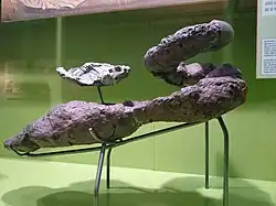 Diictodon (meaning "two weasel teeth") is an extinct genus of pylaecephalid dicynodont[5] that lived during the Late Permian period, approximately 255 million years ago. Fossils have been found in the Cistecephalus Assemblage Zone of the Madumabisa Mudstone of the Luangwa Basin in Zambia and the Tropidostoma Assemblage Zone of the Teekloof Formation, Tapinocephalus Assemblage Zone of the Abrahamskraal Formation, Dicynodon Assemblage Zone of the Balfour Formation, Cistecephalus Assemblage Zone of the Middleton or Balfour Formation of South Africa and the Guodikeng Formation of China.[6] Roughly half of all Permian vertebrate specimens found in South Africa are those of Diictodon. This small herbivorous animal was one of the most successful synapsids in the Permian period.[7]