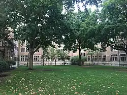 Both halls were designed in 1931 by architects Charles Donagh Maginnis and Timothy Walsh in Collegiate Gothic style. The Maginnis & Walsh was known at the time for its innovative and refined gothic design of churches and campuses in Boston, and was behind the campus architecture of Boston College and the Basilica of the National Shrine of the Immaculate Conception.[8] The architectural style of both Dillon and Alumni was in line with the previous gothic building on campus by Kervick and Fagan such as Morrissey, with local yellow brick with limestone trimmings, adorned with stone carvings on the facade and the interiors. The exterior features carvings of saints and athletes. The building is decorated with four statues by Rev. John J. Bednar, CSC, depicting St. Jerome and St. Augustine (west court), Cardinal Newman (above the southwest entrance), and St. Patrick (south wall), and a statue of Commodore Barry (located in the west court) by Hungarian sculptor Eugene Kormendi, who was sculptor in residence at Notre Dame.[9][10][11] Dillon's chapel is dedicated to St. Patrick, namesake of Patrick Dillon, and a side altar is dedicated to St. Olaf, in honor of Knute Rockne, of Norwegian ancestry, who had passed just before the construction of the hall.[12] When the halls opened in early November 1931 and three hundred freshmen moved in, the Dillon featured some of the latest technologies of the time, such as electric elevators, extension phones, buzzers, and slots for used razors.[13] The first rector was Rev. Patrick Haggerty, class of 1916.[14]