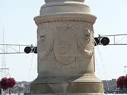The monument is an upright, fluted column surrounded by a circular basin, which functions as a fountain. A lantern sits on top of a platform capital. Bas-relief panels of lion heads and garland swags decorate the base of the column.[5] There is also a bas-relief likeness of Judge Dillon on the column.
