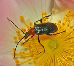 Dinoptera collaris can reach a length of 6–9 millimetres (0.24–0.35 in).[3] Elytra are bluish-blackish and rather hairy, with dense puncture. Pronotum is almost spherical, usually orange-red, sometimes dark, with sparse punctuation. Antennae are quite long. The abdomen is orange-red.[4][5]