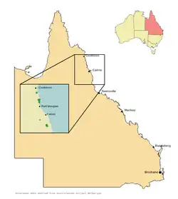 The natural range of Bernie's tamarind is from about Rossville, near Cooktown, south to Innisfail, including the Atherton Tableland southwest of Cairns. It grows in well developed rainforest, from sea level to 600 m (2,000 ft) altitude.[4][5][6][7]