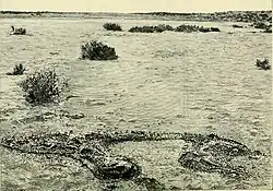 Huge assemblages of mostly-complete Diprotodon fossils have been unearthed in dry lakes and riverbeds;[1] the largest assemblage came from Lake Callabonna, South Australia.[12] Fossils were first noticed here by an aboriginal stockman working on a sheep property to the east. The owners, the Ragless brothers, notified the South Australian Museum, which hired Australian geologist Henry Hurst, who reported an enormous wealth of fossil material and was paid £250 in 1893 to excavate the site. Hurst found up to 360 Diprotodon individuals over a few acres; excavation was restarted in the 1970s and more were uncovered. American palaeontologist Richard H. Tedford said multiple herds of these animals had at different times become stuck in mud while crossing bodies of water while water levels were low during dry seasons.[13]