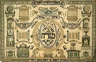 The Mizrah (literally, 'East') is a plaque or other decorative wall hanging which is placed on the eastern wall of many homes of Jews in the Diaspora to the west of Israel, in order to mark the direction of Jerusalem towards which prayer is focused.[8][9][10] A Mizrah plaque is often an artistic, ornate piece, being written in calligraphy and featuring a panorama of Jerusalem. Mizrah wall hangings typically feature the Hebrew word Mizrah (Hebrew: מזרח), and may include the verse from the Torah which states, "From the rising of the sun unto its going down, the Lord's name is to be praised" (cf. Psalm 113:3).[11][10][8]