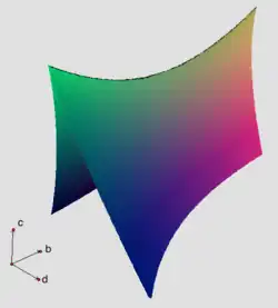 If and the surface has real points, it is either a hyperbolic paraboloid or a one-sheet hyperboloid. In both cases, this is a ruled surface that has a negative Gaussian curvature at every point.