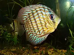 Discus are fish from the genus Symphysodon, which currently includes the species S. aequifasciatus, S. discus and S. tarzoo, based on a taxonomic review published in 2006.[10][12] A review published in 2007 largely came to the same result, but differed in nomenclature, as the species called S. tarzoo in the 2006 study was called S. aequifasciatus in the 2007 study, and S. aequifasciatus in 2006 was S. haraldi in 2007.[13][14] Further arguments have been made that S. tarzoo was not described in accordance with ICZN rules and thus should be considered invalid and replaced with S. haraldi,[15] currently considered a synonym of S. aequifasciatus by FishBase.