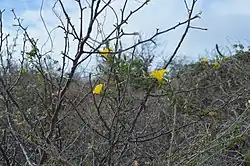 Distimake aureus is a species of vining plant in the bindweed family (Convolvulaceae) commonly known as the yellow morning-glory, yellow woodrose or yuca vine. A woody vine, this species is characterized by its large trumpet-shaped yellow flowers that bloom year-round, though most often after rain. Each of the showy flowers are only open for a single day. It is endemic to Baja California Sur, Mexico, where it can be found twining and climbing over trees, shrubs, and rocks.[2][3]