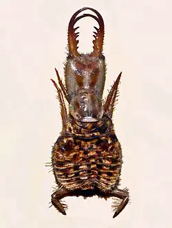 The larvae do not look anything like adults. The length of a fully grown larva is typically 12–22 millimetres (0.47–0.87 in).[8][9] The basic body color is dark brown with darker markings. The head is dark brown. The strong dark brown mandibles do not show long bristles outside the margins. Pronotum is covered by large black setae and short bristles. The dorsal side of abdomen has a series of circular markings and a characteristic dorsal median stripe. Mesothoracic and abdominal spiracles are brown. Legs may be yellowish or whitish.[4]