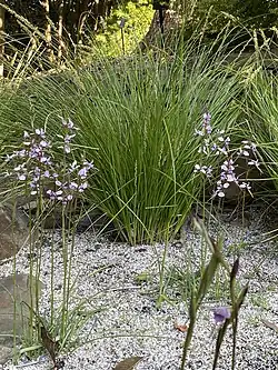 Diuris arenaria, commonly known as the Tomaree donkey orchid[2] or sand doubletail[3] is a species of orchid which is endemic to a very small area of New South Wales. It has two grass-like leaves and up to nine mauve or light purple and white flowers. It has a very limited distribution near Newcastle.