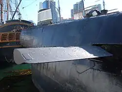 For easier berthing close alongside a jetty, submarines have used folding bow planes that retracted alongside the hull. Earlier submarines (to World War II) used vertical-folding planes perpendicular to their surface. US submarines referred to this stowage as 'rigging' the planes, and 'tilting' for their control movement.[3] Later Soviet submarines have tended to fold backwards, into recesses in the casing.