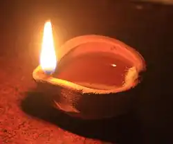 As the evening approaches, celebrants will wear new clothes or their best outfits, teenage girls and women, in particular, wear saris and jewellery.[135] At dusk, family members gather for the Lakshmi Pujan,[135] although prayers will also be offered to other deities, such as Ganesha, Saraswati, Rama, Lakshmana, Sita, Hanuman, or Kubera.[54] The lamps from the puja ceremony are then used to light more earthenware lamps, which are placed in rows along the parapets of temples and houses,[136] while some diyas are set adrift on rivers and streams.[7][137][138] After the puja, people go outside and celebrate by lighting up patakhe (fireworks) together, and then share a family feast and mithai (sweets, desserts).[54]