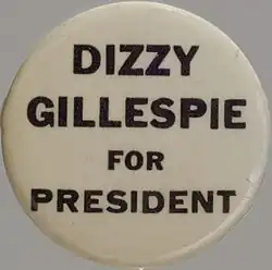 During the 1964 United States presidential campaign, Gillespie put himself forward as an independent write-in candidate.[54][55] He promised that if he were elected, the White House would be renamed the Blues House, and he would have a cabinet composed of Duke Ellington (Secretary of State), Miles Davis (Director of the CIA), Max Roach (Secretary of Defense), Charles Mingus (Secretary of Peace), Ray Charles (Librarian of Congress), Louis Armstrong (Secretary of Agriculture), Mary Lou Williams (Ambassador to the Vatican), Thelonious Monk (Travelling Ambassador) and Malcolm X (Attorney General).[56][57] He said his running mate would be Phyllis Diller. Campaign buttons had been manufactured years before by Gillespie's booking agency as a joke[58] but proceeds went to Congress of Racial Equality, Southern Christian Leadership Conference and Martin Luther King Jr.;[59] in later years they became a collector's item.[60] In 1971, he announced he would run again[61][62] but withdrew before the election.[63]