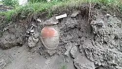 Archaeological exploration of the ruins began in 1936, but systematic excavations were not undertaken until the 1980s. In the process it became apparent that medieval pits or cellars had been dug into sand and ash deposits containing prehistoric animal bones and stone tools.[4] In 1991 a human jaw and teeth showing anatomical similarities to Homo erectus were unearthed, followed by the landmark discovery of a series of skulls between 1991 and 2005. Dated to approximately 1.85 to 1.75 million years ago, these finds made Dmanisi one of the most ancient human habitation sites anywhere in Eurasia.[9][10][11] In 2007, the Dmanisi Hominid Archaeological Site was added on the Tentative List of UNESCO World Heritage Centre.[12]