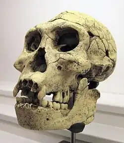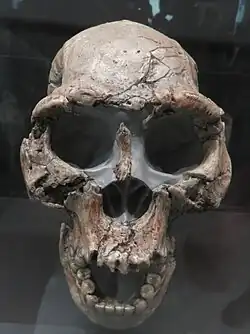 In addition to the skulls, about a hundred postcranial remains have been discovered.[4] The first postcranial fossil discovered was a third metatarsal bone, recovered in 1997.[17] Postcranial fossils comprise bones from all parts of the body and include parts of the arms,[18] legs,[19] axial skeleton (vertebrae and ribs)[19] and feet.[20] The bones, some of them confidently associated with Skull 3, are from both adolescent and adult individuals.[18]