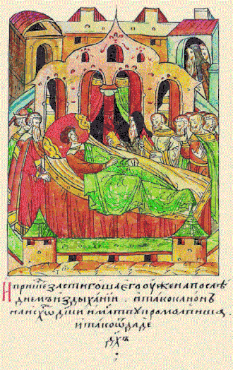 In the fall of 1440[b] Dmitry Krasny, still a young man, suddenly died in his inheritance Bezhetsky Verkh. The description of his death in the chronicle is uniquely in-depth and emotional, with many details. At first he was sick for a long time, he could not eat, lost sleep and even seemed to go deaf. On Sunday, 18 September he was able to take the sacrament, although he was bleeding from his nose and through the pores on his skin. After the sacrament, for a short time he felt better, he was able to eat a little. At night, his condition worsened, it even seemed to others that he had already died. However, he suddenly came to life and the next two days he read out loud prayers and sang psalms but talked with people around him off the mark. This delusional state ended on Wednesday, and the next day, September 22, Dmitry Krasny died. The body was brought to Moscow only on October 14, and when they opened the temporary coffin to move the body to a stone tomb, it did not show any signs of decay, "his face was white as that of a sleeping man". He was buried in the same grave with his father Yury of Zvenigorod in Cathedral of the Archangel.[17]
