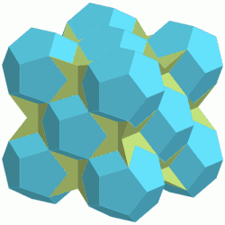 | Honeycomb of alternating convex and concave pyritohedra with heights between ±1/φ | Heights between 0 (cube) and 1 (rhombic dodecahedron) |