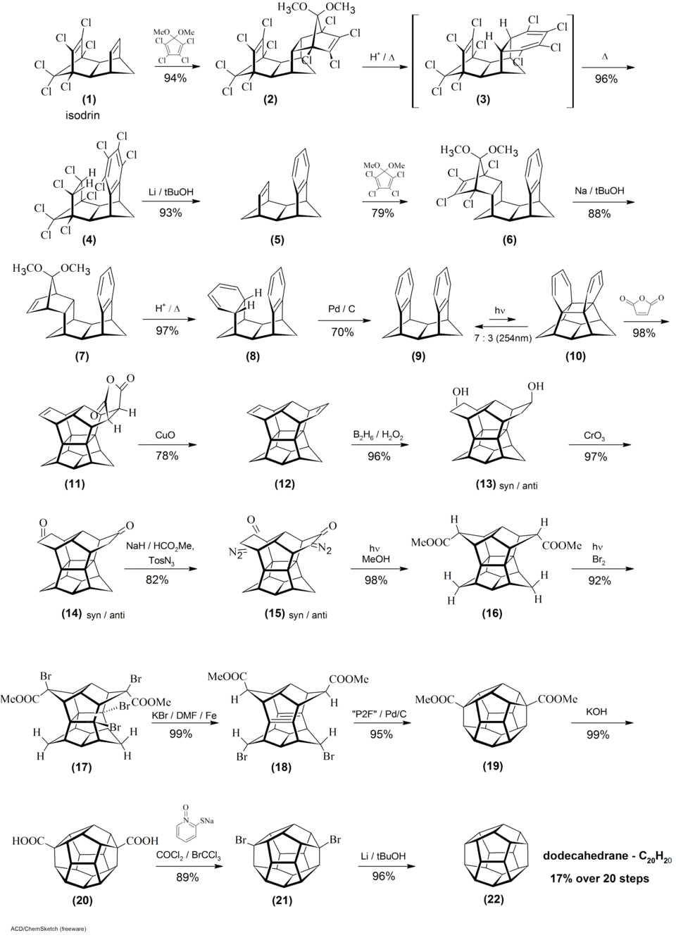 Leo Paquette's group at Ohio State University was the first to succeed, by a complex 29-step route that mostly builds the dodecahedral skeleton one ring at a time, and finally closes the last hole.[2]