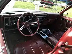 The Mirada came standard with a brushed aluminum finish on the instrumental panel, with faux woodgrain finish offered as an option. The base seats were cloth Sport bucket seats, while optional seats included vinyl Sport bucket seats, cloth and vinyl 60/40 split bench seats, and leather and vinyl bucket seats.[3] Since the Mirada could be chosen with either a column shift or floor shift, the bench seat was only offered with the column shifter. Buyers had the choice of either an AM/FM stereo or an AM/FM/cassette stereo, an AM/FM/8-track stereo, and a Chrysler CB radio could be chosen as well. Available steering wheels included two iterations of base 2-spoke wheels, an optional 3-spoke Mopar "Tuff Wheel" and an optional 4-spoke sport wheel. Manual windows were standard on the base model, but the power windows from the CMX could be ordered on the base models as well.