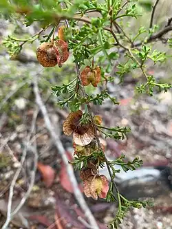 Dodonaea uncinata is a dioecious, spreading shrub that typically grows to a height of up to 1 m (3 ft 3 in). It has imparipinnate leaves 4–10 mm (0.16–0.39 in) long on a petiole 3–5.5 mm (0.12–0.22 in) long with 6 to 8 leaflets. The leaflets have three teeth on the end and a wedge-shaped base, 2.6–5 mm (0.10–0.20 in) long and 1.5–3 mm (0.059–0.118 in) wide, the end leaflet shorter and strongly curved downwards, or hooked. The flowers are arranged singly, in pairs or groups of three, each flower on a pedicel 3–6.5 mm (0.12–0.26 in) long. There are 4 lance-shaped to egg-shaped sepals 1.6–3 mm (0.063–0.118 in) long, 8 stamens, and the ovary is glabrous. Flowering occurs from May to June, and the capsule is egg-shaped or elliptic, 11–16 mm (0.43–0.63 in) long and 8.5–14 mm (0.33–0.55 in) wide with 4 membranous wings, 3–4.5 mm (0.12–0.18 in).[2][3]