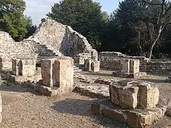 The basilica is dated, on architectural and archaeological grounds, to the middle of the 5th century. It is built over an earlier church, 25 metres in length and about 15 metres in width.[8][9] A sample obtained from this earliest layer is carbon dated to AD 387.[10] It was probably destroyed in an earthquake at the same time as the church at Chabukauri. The superimposed 5th-century basilica was also damaged in a later earthquake. The nave and the church's immediate premises continued to be used as a burial ground. The northeastern corner of the church was adapted in the 8th or 9th century as a mortuary chapel which remained functional until at least the 12th–13th century.[8]