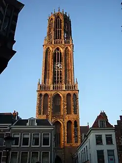 The Dom Tower (Dutch: Domtoren 'Cathedral Tower') of Utrecht is the tallest church tower in the Netherlands,[1] at 112.32 metres (368,5 feet) in height.[2] It is considered the symbol of Utrecht.[1] The tower was part of St. Martin's Cathedral, also known as the Dom Church, and was built between 1321 and 1382,[1] to a design by John of Hainaut.[3] The cathedral was never fully completed due to lack of money. Since the unfinished nave collapsed in 1674, the Dom tower has been a freestanding tower. The tower stands at the spot where the city of Utrecht originated almost 2,000 years ago.[1]